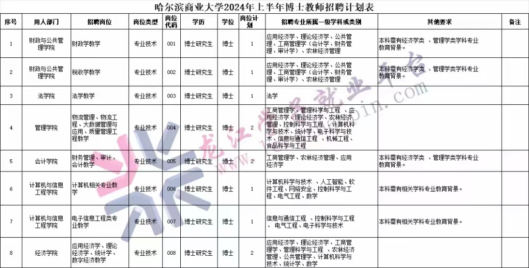 (八)各崗位的數(shù)量、專(zhuān)業(yè)及具體要求,詳見(jiàn)《哈爾濱商業(yè)大學(xué)2024年上半年博士教師招聘計(jì)劃表》(附件1)。