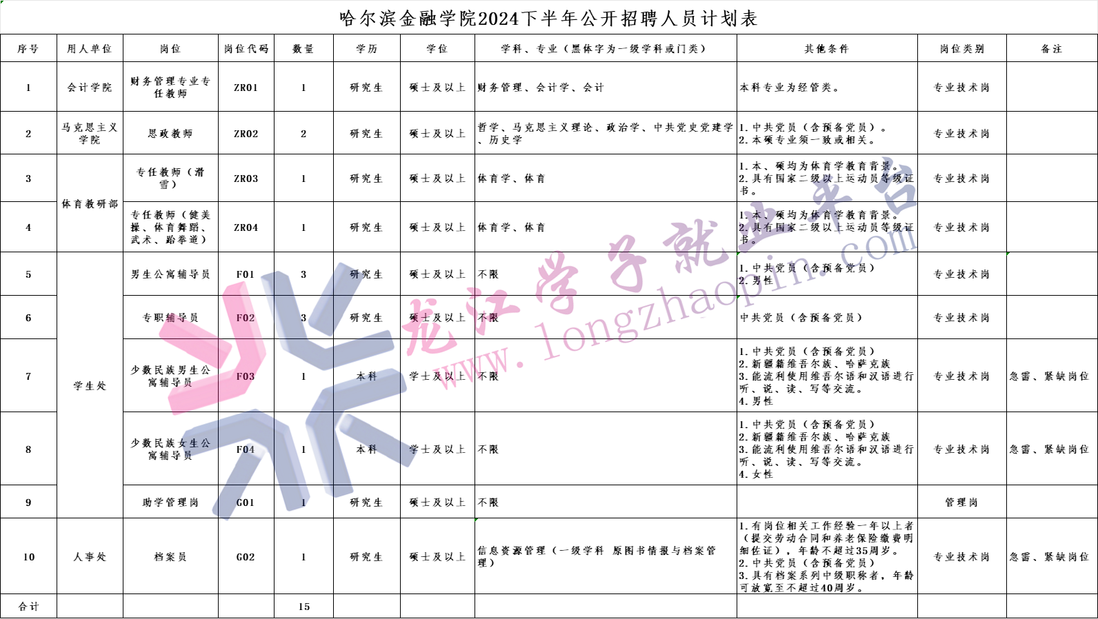 招聘人數(shù)詳見附件1-《哈爾濱金融學(xué)院2024下半年公開招聘人員計劃表》。