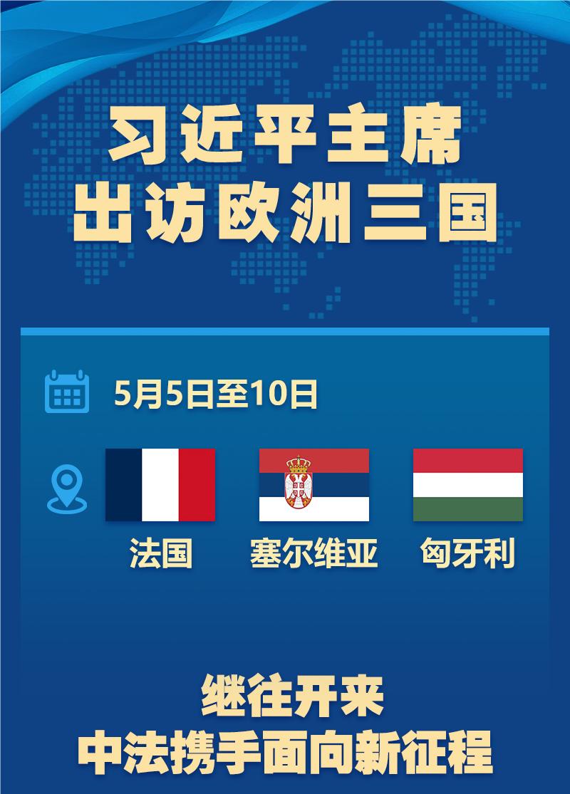 ??應(yīng)法蘭西共和國總統(tǒng)馬克龍、塞爾維亞共和國總統(tǒng)武契奇、匈牙利總統(tǒng)舒尤克和總理歐爾班邀請(qǐng),國家主席習(xí)近平將于5月5日至10日對(duì)上述三國進(jìn)行國事訪問。